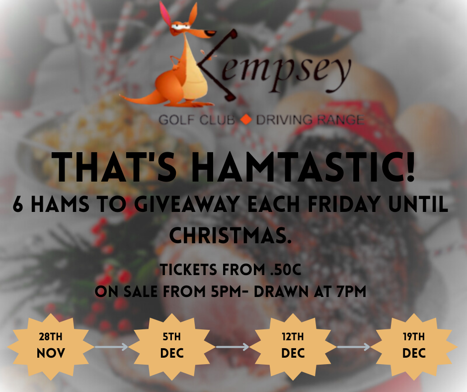 Join us at the Kempsey Golf Club each Friday night until Christmas for your chance to win one of six delicious hams from your local Milly Hill Meats. We will also have our club vouchers as usual for bonus prizes.